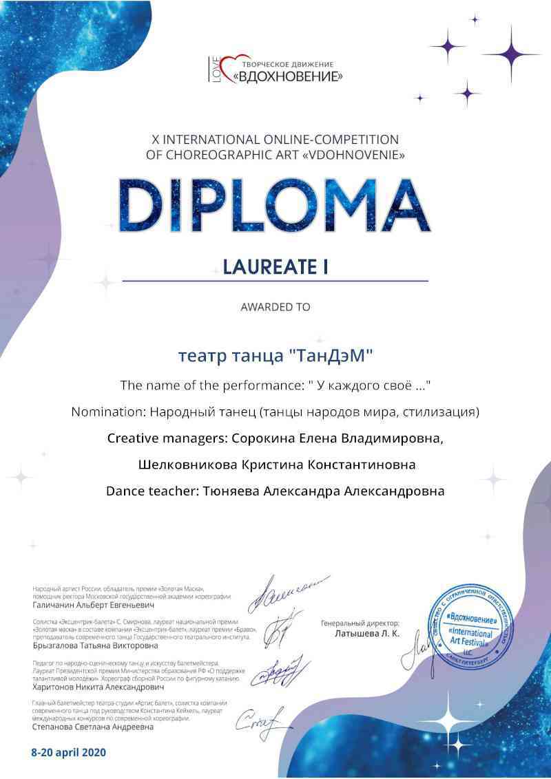 Мичуринский Театр танца «ТанДэМ» стал лауреатом первой степени в номинации «Народный танец (танцы народов мира, стилизация)!