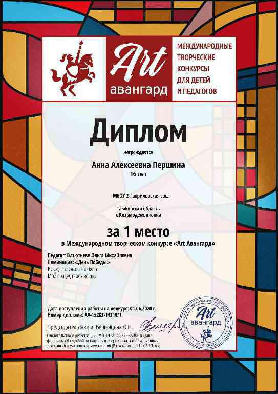 Першина Анна обучающаяся МБОУ 2-Гавриловской сош за 2019-2020 учебным год проявила себя во многих конкурсах Всероссийского международного формата. Наиболее важными стали защита проекта и получение диплома победителя регионального этапа Всероссийского конкурса исследовательских работ «Правнуки победителей», получение поощрительной грамоты за участие во Всероссийском конкурсе исторических исследовательских работ «Человек в истории России ХХ века». Анна получила диплом 1-степени Международного творческого конкурса «Аrt- Авагард» Творческие и исследовательские работы Першиной Анны являются не только плодотворным результатом педагогов, но и источником информации о маленьком Гавриловском районе Тамбовской области нашей огромной страны России.