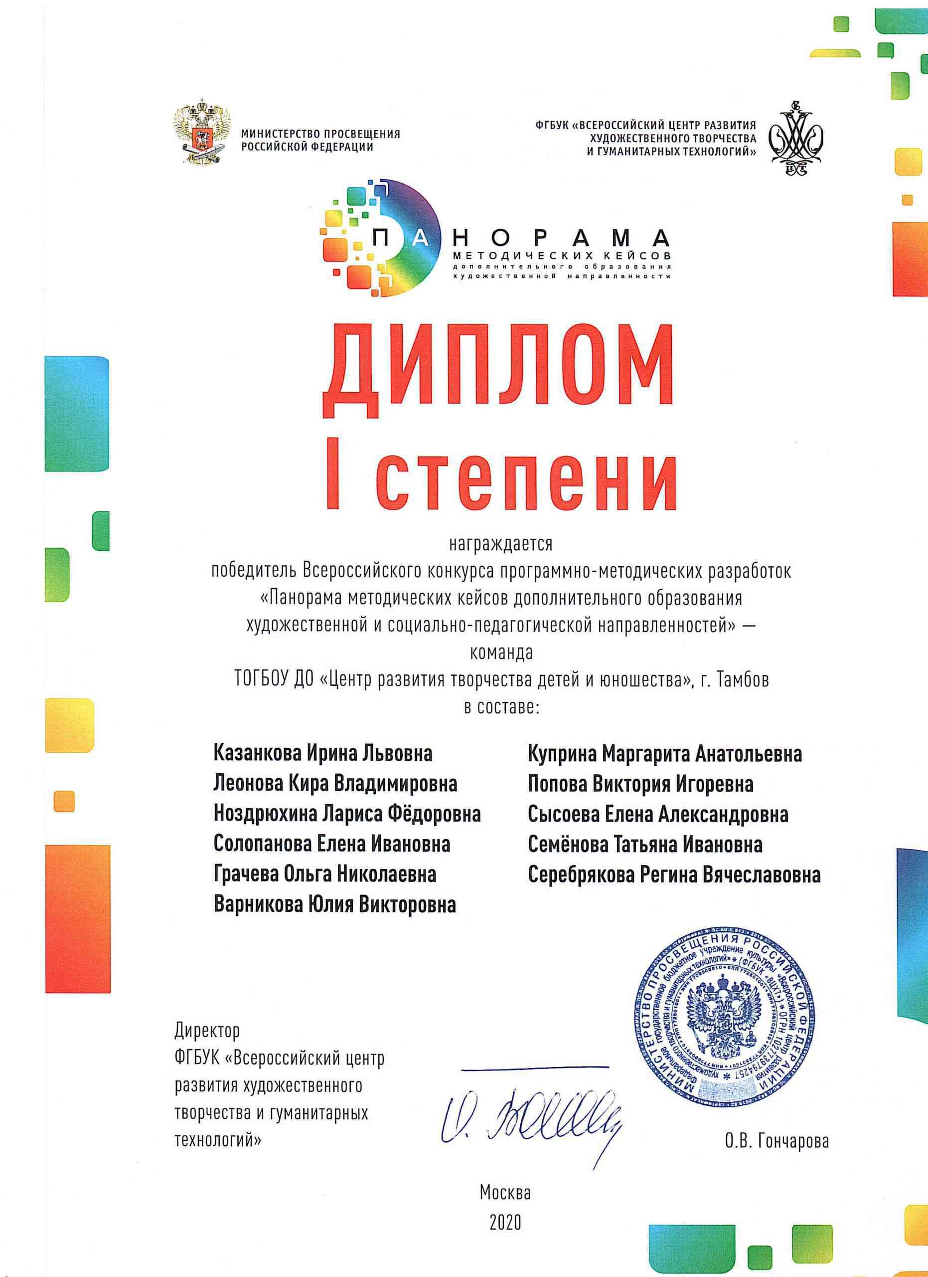 дипломом I степени в номинации «Образцовый детский коллектив» с методическим кейсом «Образцовый детский коллектив «Тамбовчата»;