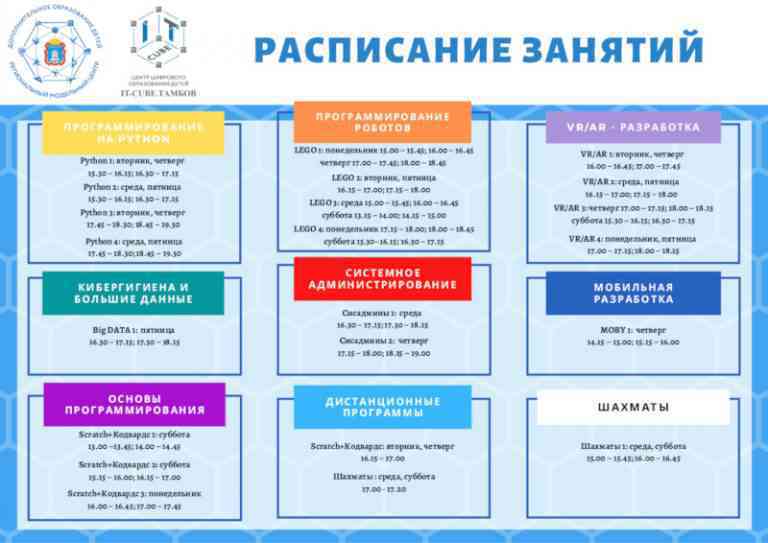 Центр цифрового образования детей «IT-куб. Тамбов» – реализуется в рамках проекта «Образование» по инициативе Министерства просвещения РФ и Агентства стратегических инициатив при участии международных компаний-лидеров в сфере информационных технологий. Обучение предполагает реализацию совместных практических проектов с ведущими федеральными и региональными компаниями и предприятиями реального сектора экономики, интеллектуальными партнерами, вузами.