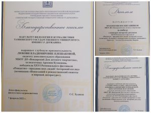 Подведены итоги XXVI Регионального онлайн -фестиваля «Рождество — праздник всех людей! Авторский взгляд», организованный факультетом филологии и журналистики ТГУ им.Г.Р. Державина .В номинации «Новогодний и рождественский сюжеты в мировой литературе» дипломом за 2 место в младшей возрастной группе награжден Арсений Кузнецов, воспитанник педагога Л. В. Плешаковой. Турак Ксения, Филиппова Арина, Березина Елизавета получили сертификаты участников. Благодарственным письмом отмечены педагоги Аппоротова Т.Н., Плешакова Л.В., Федулеева В.С. за подготовку коллектива воспитанников-победителей фестиваля в номинации «Рождественское чудо. Авторские рисунки, поделки, анимация». Особенно приятен диплом коллективу воспитанников дома творчества в номинации «За верность национальным духовным традициям».