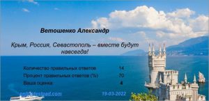 Обучающиеся 2-3 «Г» класса ( классный руководитель Ф.Е.Сутормина) филиала МБОУ «Ржаксинская СОШ №2 имени Г.А. Пономарёва» в п.Пахарь провели выходные с пользой – выполнили викторину «Крым, Россия, Севастополь – вместе будут навсегда!»