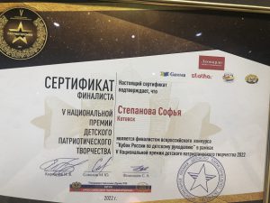 Премия проводится в четыре этапа по 13 номинациям и объединяет более 15 000 детей из всех субъектов РФ. Имена победителей жюри огласило в мае. В рамках данной Премии проходил Всероссийский конкурс «Кубок России по детскому рукоделию». От центрального федерального округа в число финалистов конкурса прошла Степанова Софья. Для финалистов были приготовлены творческие задания, высланы материалы, из которых необходимо было выполнить творческую работу на свободную тему. Софья изготовила кокошник с вышивкой бисером и лентами.