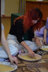 Способ снятия агрессивного состояния через физическую активность хореограф Болтнева Лилия Юрьевна продемонстрировала играми «Сороконожка», «Рубим дрова», «Скалолаз». А вот средства саморегуляции использовала в своей работе педагог-психолог Кузнецова Марина Александровна через дыхательное упражнение, рисование песком, релаксацию. Притча о двух волках нацелила подростков на позитивный выбор между добрым и агрессивным поведением людей.