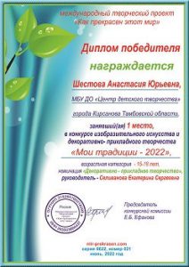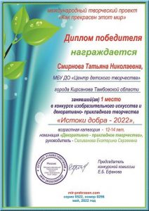 Учащиеся МБУ ДО «Центр детского творчества» города Кирсанова Тамбовской области Смирнова Татьяна и Шестова Анастасия (руководитель – педагог дополнительного образования Селиванова Екатерина Сергеевна) приняли участие в конкурсах изобразительного искусства и декоративно-прикладного творчества «Истоки добра» и «Мои традиции», организованных в рамках проекта.
