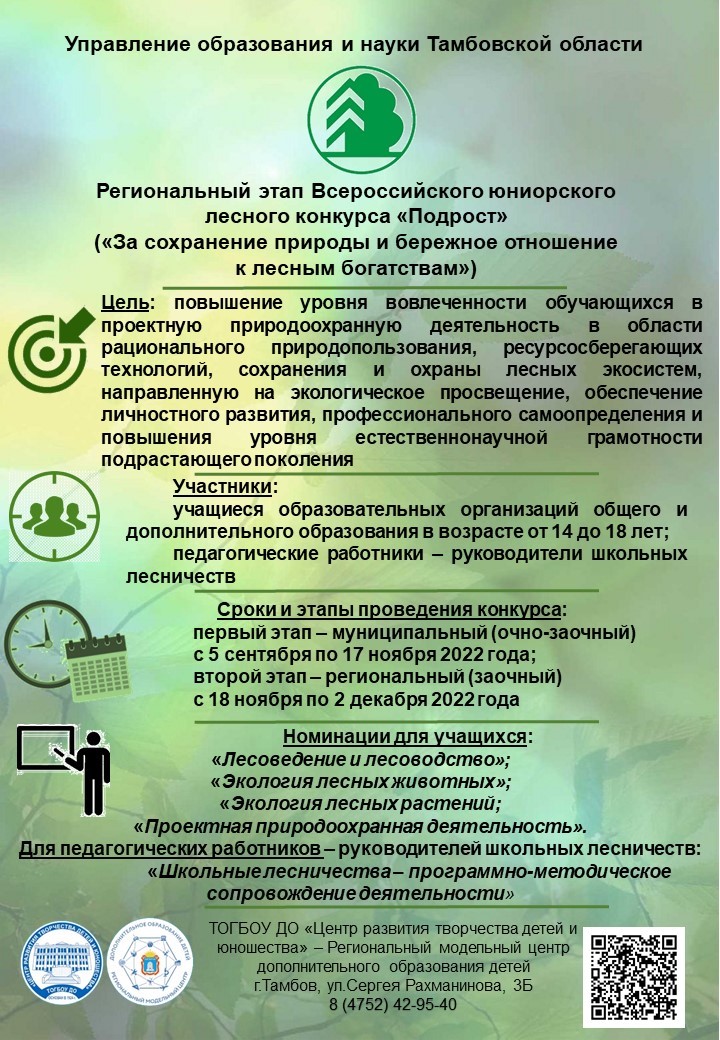 Ежегодный конкурс «Подрост» проводится в целях повышения уровня вовлеченности обучающихся в проектную природоохранную деятельность в области рационального природопользования, ресурсосберегающих технологий, сохранения и охраны лесных экосистем, направленную на экологическое просвещение, обеспечение личностного развития, профессионального самоопределения и повышения уровня естественнонаучной грамотности подрастающего поколения.