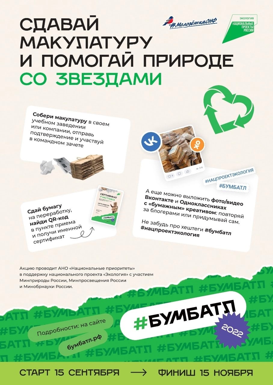 Всероссийская акция по сбору макулатуры #БумБатл – это возможность проявить заботу о природе, сдав бумагу на переработку. Но, как и любой батл, это еще и соревнование по количеству собранной макулатуры!