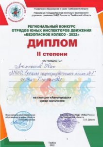 Команда ЮИДовцев «Светофор» учащиеся МБОУ «СОШ №1» и обучающиеся объединения «ЮИД» МБУ ДО «Центр детского творчества» в составе: Ломоносова Ивана, Филиппова Никиты, Третьяк Павла, Загумённиковой Ольги, Поповой Дарьи представляла наш город на «Безопасном колесе -22». В Конкурсе принимало участие 30 команд из областных муниципалитетов. Команда города Кирсанова достойно выступила на всех этапах, проявив знание ПДД, показав мастерство фигурного вождения велосипеда и знания правил вождение в Автогородке. Ломоносов Иван стал призёром, заняв почётное 2 место на станции «Автогородок» среди мальчиков.