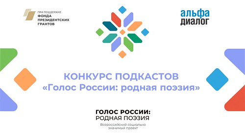 С 25 августа по 25 октября 2022 года проходит конкурс подкастов (радиопередач) «Голос России: родная поэзия». К участию приглашаются школьники и педагоги со всей страны. Конкурс проводится Центром «Альфа-Диалог» при поддержке Фонда президентских грантов.