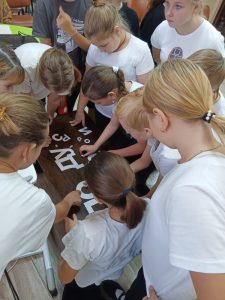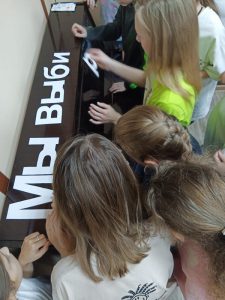 Весело и дружно участники мероприятия поиграли в игру «Составь фразу». Разбившись на команды, они разместили буквы в порядке убывания размера. И у них получились две замечательные фразы: «Мы выбираем жизнь!» и «Подружись со спортом!»