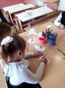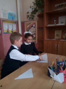 Рассмотрев картинки с изображением голубей, сложили их из бумаги в технике оригами. Мы приглаживали пальцем каждую линию заготовки, и все поделки получились аккуратными.