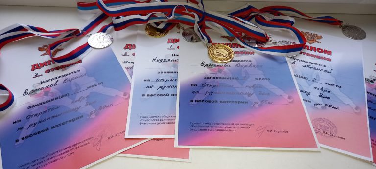Открытый ковер по рукопашному бою среди мальчиков и девочек 8-9, 10-11 лет состоялся в городе Тамбове. В упорной борьбе соревновались более 70 участников из Липецкой и Тамбовской областей. Команда МБОУ ДО Бондарского дома детского творчества привезла из Тамбова – два первых места (Кудряшова Анастасия и Ермакова Варвара) и шесть вторых (Ермаков Кирилл, Рыков Матвей, Рыков Степан, Кудряшова Анастасия, Баранов Алексей, Попов Даниил).