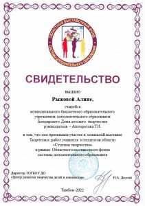 Обучающиеся МБОУ ДО Бондарского Дома детского творчества Рыжова Алина, Золотарева Валерия и Ермакова Варвара (рук. Т.Н. Аппоротова), Федулеева Василиса, Малышев Никита (рук. В.С.Федулеева) получили свидетельства об участии в зональной выставке творческих работ «Ступени творчества».