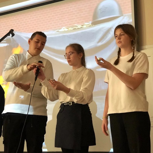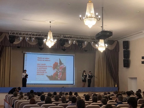 В завершении линейки в актовом зале состоялась минута молчания. Ученики почтили память защитников Москвы стоя.