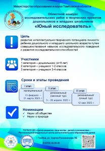 Областной конкурс исследовательских работ и творческих проектов дошкольников и младших школьников «Юный исследователь» проводится с 13 февраля по 12 мая 2023 года в целях развития интеллектуально-творческого потенциала личности ребенка путем совершенствования навыков исследовательского поведения и развития исследовательских способностей.