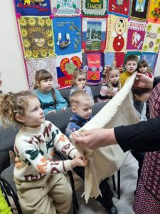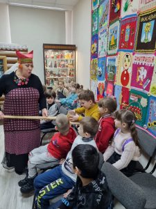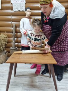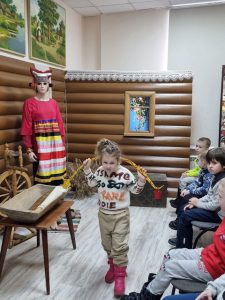 Ребятам рассказали, что частью русской избы является печь, что она накормит и обогреет, и сон на ней хорош. Главными помощниками в избе являются — кочерга, ухват, чугунок. Воспитанники узнали, как раньше ходили за водой и для чего нужно коромысло. Так же ребята поведали как веселились ребятишки в старину. И для чего используют приданное.