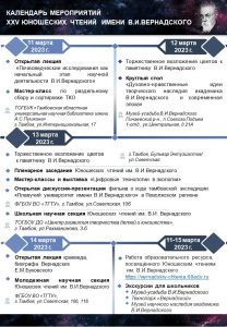 13 марта в 10.00 на базе Тамбовского государственного технического университета состоится торжественное открытие чтений и пленарное заседание «Современное развитие идей Вернадского В.И. как основа ценностей научного познания и просветительства», в котором примут участие около 200 школьников, студентов, педагогов, молодых и ведущих ученых Тамбовской области, представителей ведомств в сфере образования и науки, экологии и природных ресурсов, топливно-энергетического комплекса и жилищно-коммунального хозяйства.