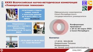 25-26 марта 2023 года в Санкт-Петербургском государственном университете состоится очная XXXII Всероссийская научно-методическая конференция «Университетская гимназия».
