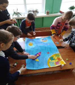 11 апреля 2023 г. в филиале МБОУ «Ржаксинская СОШ №1 им. Н.М. Фролова» в с. Золотовка прошло занятие кружка «ШКОЛА МАСТЕРОВ». Коллективная работа «Космические дали» выполнена накануне Дня космонавтики и посвящена освоению космоса. Дружно, с фантазией и шутками работали ребята, придумали имена жителям других планет и пригласили их в гости. Мы готовы покорять космос!