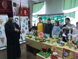 С приветственным словом к первым посетителям выставки обратился настоятель Благовещенского храма священник Иоанн Масягин, он отметил важность творческой деятельности к приобщению детей к православным праздникам.
