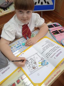 Затем ребята познакомились с содержанием рабочих тетрадей по ПДД и выполнили несколько заданий из них. В конце занятия учащиеся получили в подарок световозвращающие брелоки и хорошее настроение.