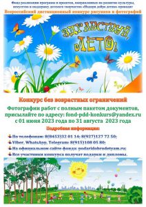Фонд реализации программ и проектов, направленных на развитие культуры, искусства и поддержку детского творчества «Подари добро детям» объявляет о проведении Всероссийского дистанционного конкурса рисунков и фотографий «Здравствуй, лето!», который пройдет в период с 01 июня по 31 августа 2023 года включительно, с целью: формирования активной жизненной позиции детей и взрослых посредством творчества, стимулирования развития креативного мышления, творческого самовыражения детей, взрослых, выявления и поддержки талантливых детей, эстетического воспитания и развития детей.
