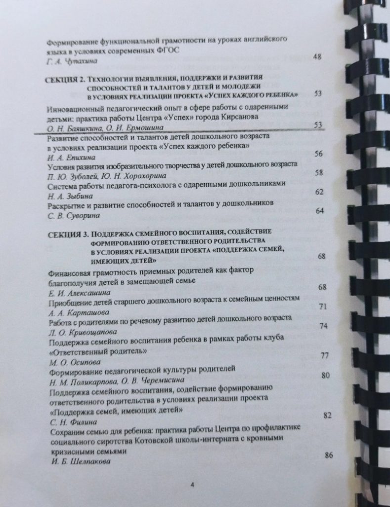 Педагоги МБУ ДО «Центр детского творчества» О.Н. Баяшкина и О.И. Ермошина приняли участие в областной научно-практической конференции «Психолого-педагогическое сопровождение участников образовательных отношений в условиях реализации национальных проектов и программ». По итогам конференции был выпущен сборник, где была опубликована статья из опыта работы «Инновационный педагогический опыт в сфере работы с одарёнными: практика работы Центра «Успех» города Кирсанова.