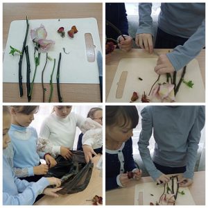 На первом этапе дети осторожно отрезали стебли роз из увядшего букета. Затем завернули стебли во влажную газету и поместили в мусорный мешок, создавая внутри небольшую «теплицу» для будущих корешков.