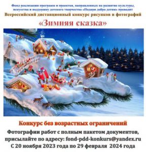 Фонд реализации программ и проектов, направленных на развитие культуры, искусства и поддержку детского творчества «Подари добро детям» с 20 ноября 2023 года по 29 февраля 2024 года проводит Всероссийский дистанционный конкурс рисунков и фотографий «Зимняя сказка».