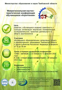 Конференция проводится с 22 января по 28 февраля 2024 года и направлена на развитие у обучающихся аграрной грамотности и культуры, активизации творческой, познавательной, исследовательской, проектной деятельности в области агротехнологий.
