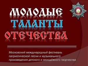 23 – 24 мая 2024 года в Краснознаменном зале Московского Дома Ветеранов Войн и Вооруженных Сил пройдет Восьмой Московский международный фестиваль патриотической песни и музыкального произведения детского и молодежного творчества «Молодые таланты Отечества», посвященный 80-летию освобождения Ленинграда, Крыма и Севастополя, 315-летию Победы Петра I в Полтавском сражении и Дню России.