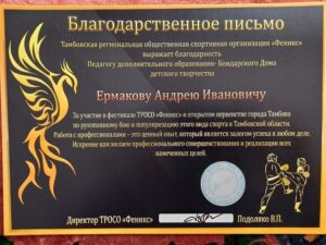 За активное участие в фестивале и первенстве, а также за популяризацию рукопашного боя среди молодежи Тамбовской области педагог дополнительного образования Андрей Ермаков отмечен Благодарственным письмом Тамбовской региональной общественной спортивной организации «Феникс».