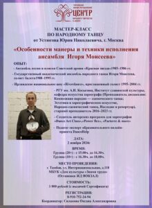 Мастер-класс «Особенности манеры и техники исполнения ансамбля Игоря Моисеева» состоится 2 ноября 2024 года на базе Дома культуры «Знамя труда». Мастер-класс проводит ведущий педагог — экс-солист Государственного академического ансамбля танца имени Игоря Моисеева» Юрий Николаевич Устюгов, г. Москва.