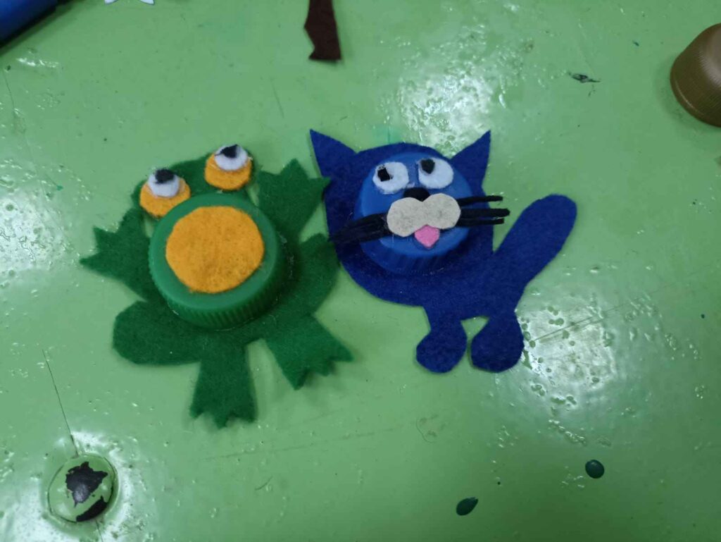 Ребята дали вторую жизнь пластиковым крышкам, сделав из них занимательные игрушки – любимых животных.