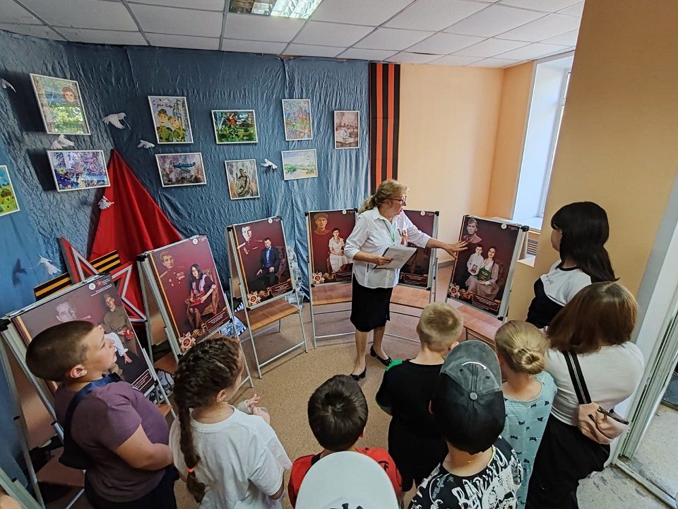 Вместе с экскурсоводом воспитанники лагерей с дневным пребыванием детей знакомятся с биографиями участников Великой Отечественной войны, делятся своими знаниями о событиях военных лет, рассказывают о своих предках, которые участвовали в боевых действиях, были тружениками тыла.