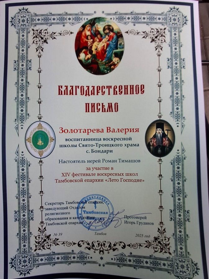 24 июля 2025 г. в Православном молодежном центре «Спас» Тамбовской епархии состоялся XIV фестиваль воскресных школ Тамбовской епархии, посвященный 190-летию обретения иконы Божией Матери «Тамбовская»; 100-летию блаженной кончины святителя Тихона, Патриарха Московского и всея России, 80-летию Победы в Великой Отечественной войне, Году защитника Отечества.