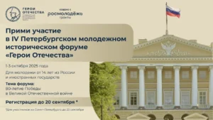 В период с 1 по 3 октября 2025 года в городе Санкт-Петербурге пройдет IV Петербургский молодежный исторический форум «Герои Отечества» по инициативе команды школьников и студентов при поддержке Министерства просвещения Российской Федерации, Федерального агентства по делам молодёжи, Российского исторического общества, «Движение Первых», депутатов Государственной Думы и сенаторов Российской Федерации.