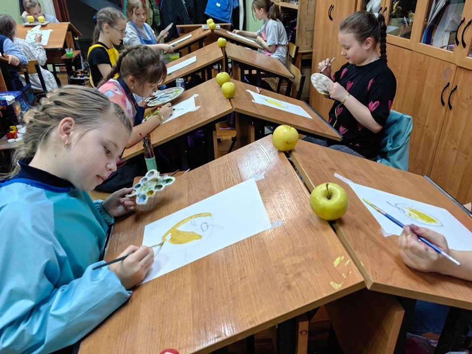 Юные художники нарисовали натюрморт с яблоками, которые являются источниками витаминов, а также создали картины в технике «раздувание трубочкой». Данная техника рисования не только интересная, но и полезная, так как выдувание через трубочку укрепляет дыхательную систему ребенка.