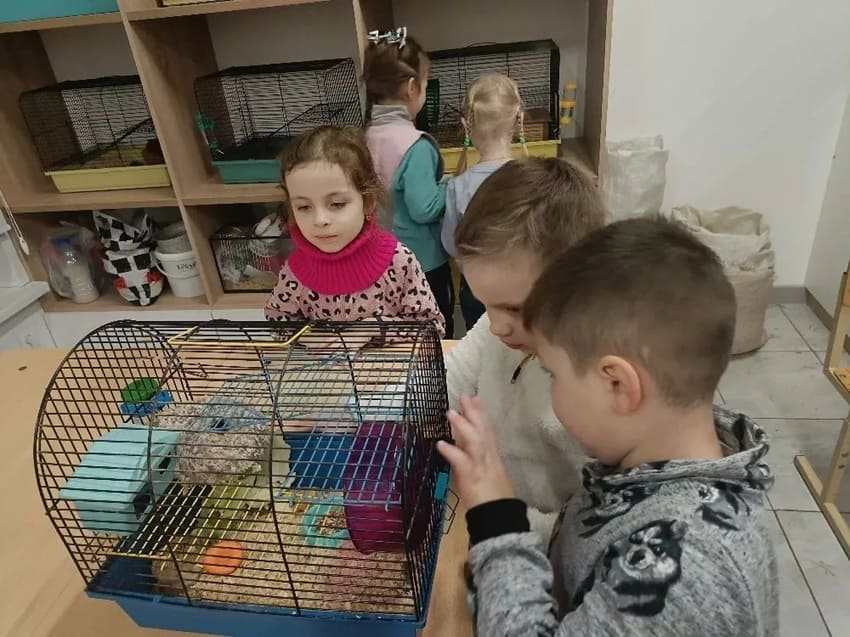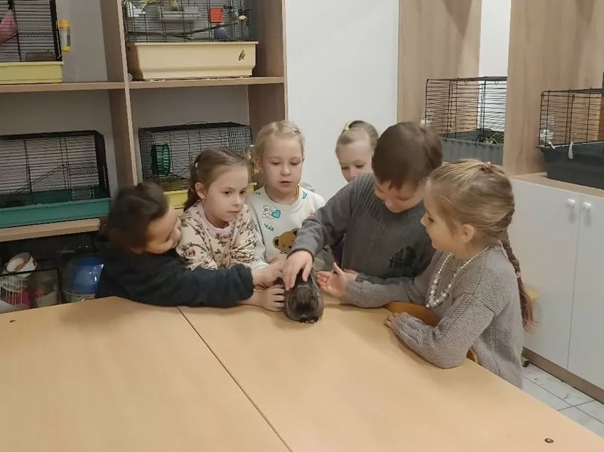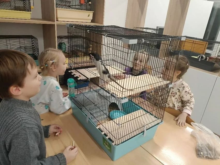 Детям очень понравилось общение с питомцами: они с радостью гладили кроликов, наблюдали за волнистыми попугаями, декоративными крысами, красноухой черепахой и хомяками.