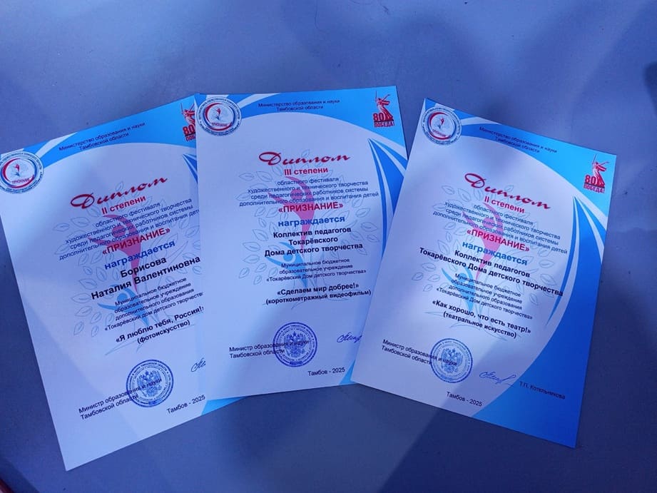Токаревский Дом детского творчества представлял работы в трех номинациях: «Как хорошо, что есть театр!» (театральное искусство), «Сделаем мир добрее!» (короткометражный видеофильм), «Я люблю тебя, Россия!» (фотоискусство) и в каждой из них занял призовое место. Поздравляем педагогов и желаем творческих успехов!