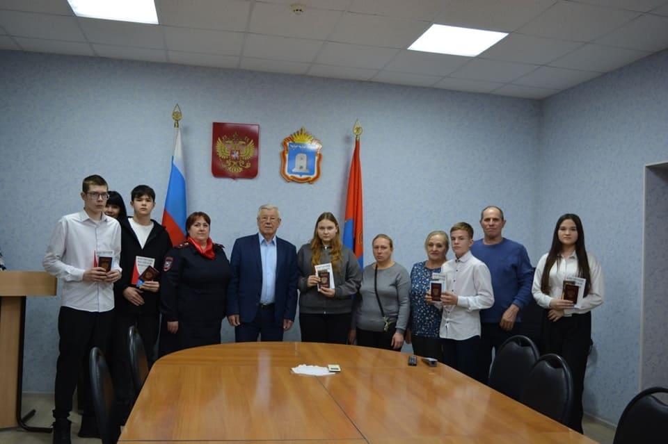 Паспорт Егору Земелеву, Дмитрию Остроухову, Артёму Попову, Анастасии Гончаровой и Софии Покидовой вручили глава Токаревского округа Виктор Айдаров и майор полиции, начальник миграционного пункта отделения полиции в р. п. Токарёвка Елена Кочетова.
