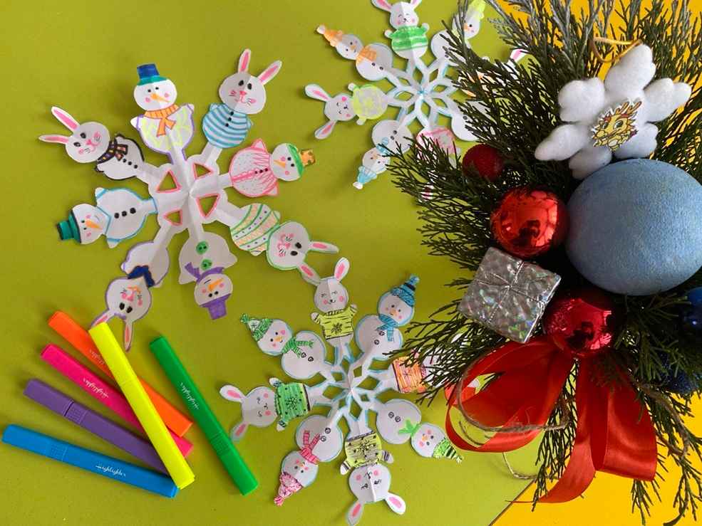 Воздух был наполнен креативным беспорядком: на столах мерцали блестки, цветная бумага превращалась в сказочных персонажей и украшения. Самым популярным занятием было изготовление елочных игрушек и, конечно же, символа года — лошадок. Другие, вооружившись ножницами и клеем, мастерили снежинки.