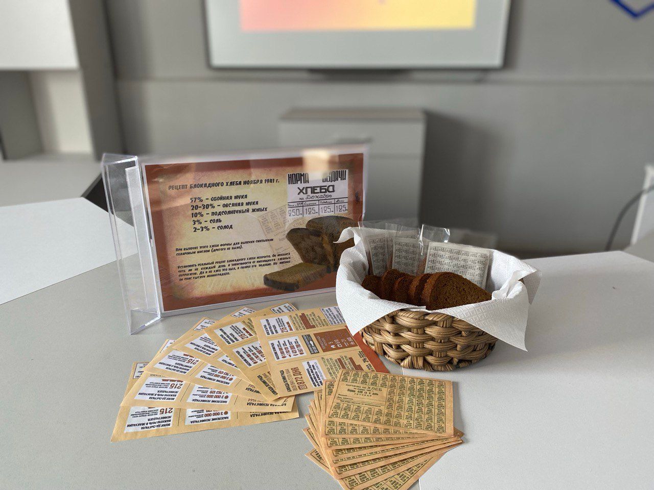 В рамках этой акции волонтеры раздали символический кусочек хлеба и карточки с информацией о различных фактах того времени.