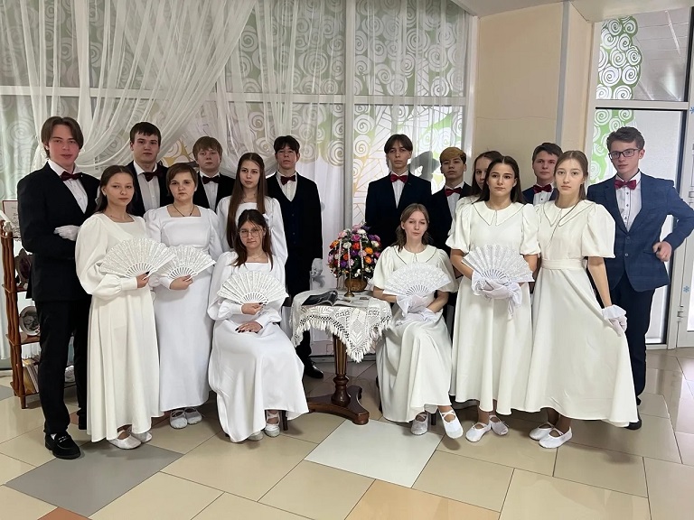 Сосновские школьники представили мазурку, затем поиграли и исполнили вальс дружбы. Завершил бал общий вальс.