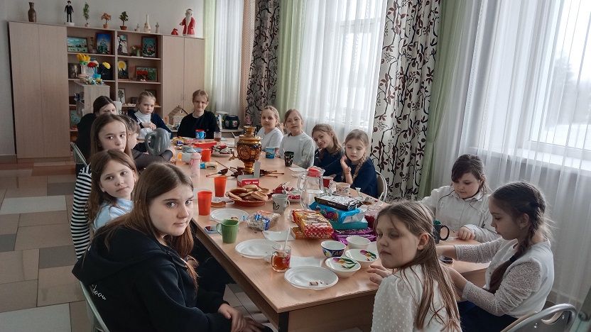 А завершилось мероприятие русским застольем: дети с удовольствием пили чай с вареньем и блинами, отгадывали загадки и слушали русскую народную музыку.