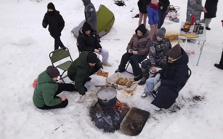Ребята с педагогами ДДТ отправились в однодневный зимний поход по маршруту р.п. Токаревка – д. Александровка – д. Мамонтово – р.п. Токаревка. В деревне Александровка на территории школы с учащимися были организованы игры «Зимние забавы» с элементами туризма. В процессе игры дети учились собирать рюкзак, ставить палатку, разводить костер на снегу. Катание на санках, горячий чай на свежем воздухе, лепка снеговика доставили детям большое удовольствие. Ребята посетили мемориал, посвященный солдатам Великой Отечественной войны и Святой источник в д. Мамонтово.