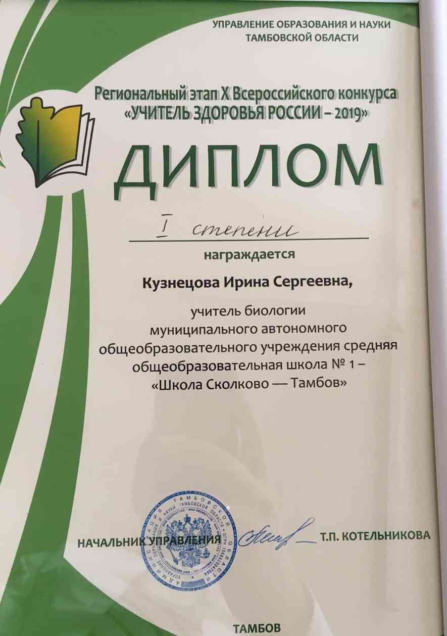 Кузнецова Ирина Сергеевна, учитель биологии МАОУ СОШ №1 — «Школа Сколково — Тамбов» — 1 степень;