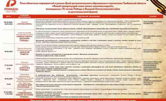 СКАЧАТЬ План областных мероприятий в рамках Дней дополнительного образования и воспитания Тамбовской области «Вашей немеркнущей славе память потомков верна!», посвященных 75-летию Победы в Великой Отечественной […]