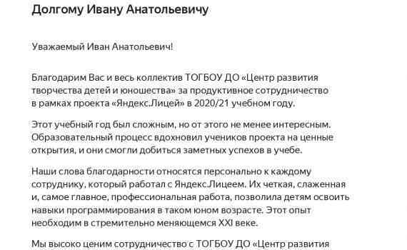 «Уважаемый Иван Анатольевич! Благодарим Вас и весь коллектив ТОГБОУ ДО «Центр развития творчества детей и юношества» за продуктивное сотрудничество в рамках проекта «Яндекс.Лицей» в 2020/21учебном […]