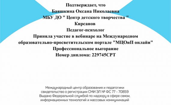 Педагог-психолог МБУ ДО «Центр детского творчества» Баяшкина О.Н. 15 июня 2022 приняла участие в вебинаре на Международном образовательно-просветительском портале «МЦОиП онлайн» на тему «Профессиональное выгорание»